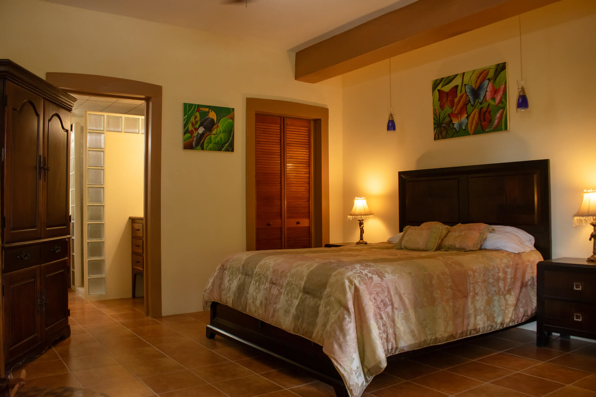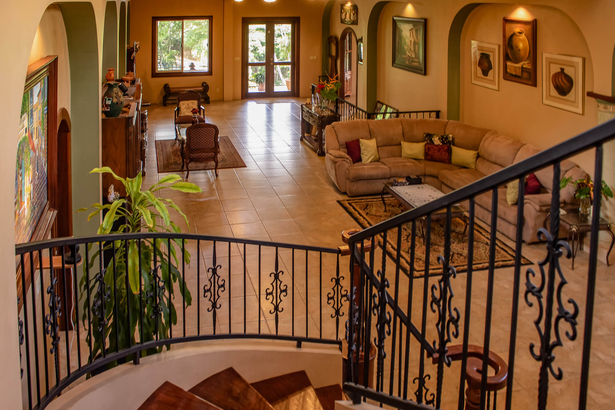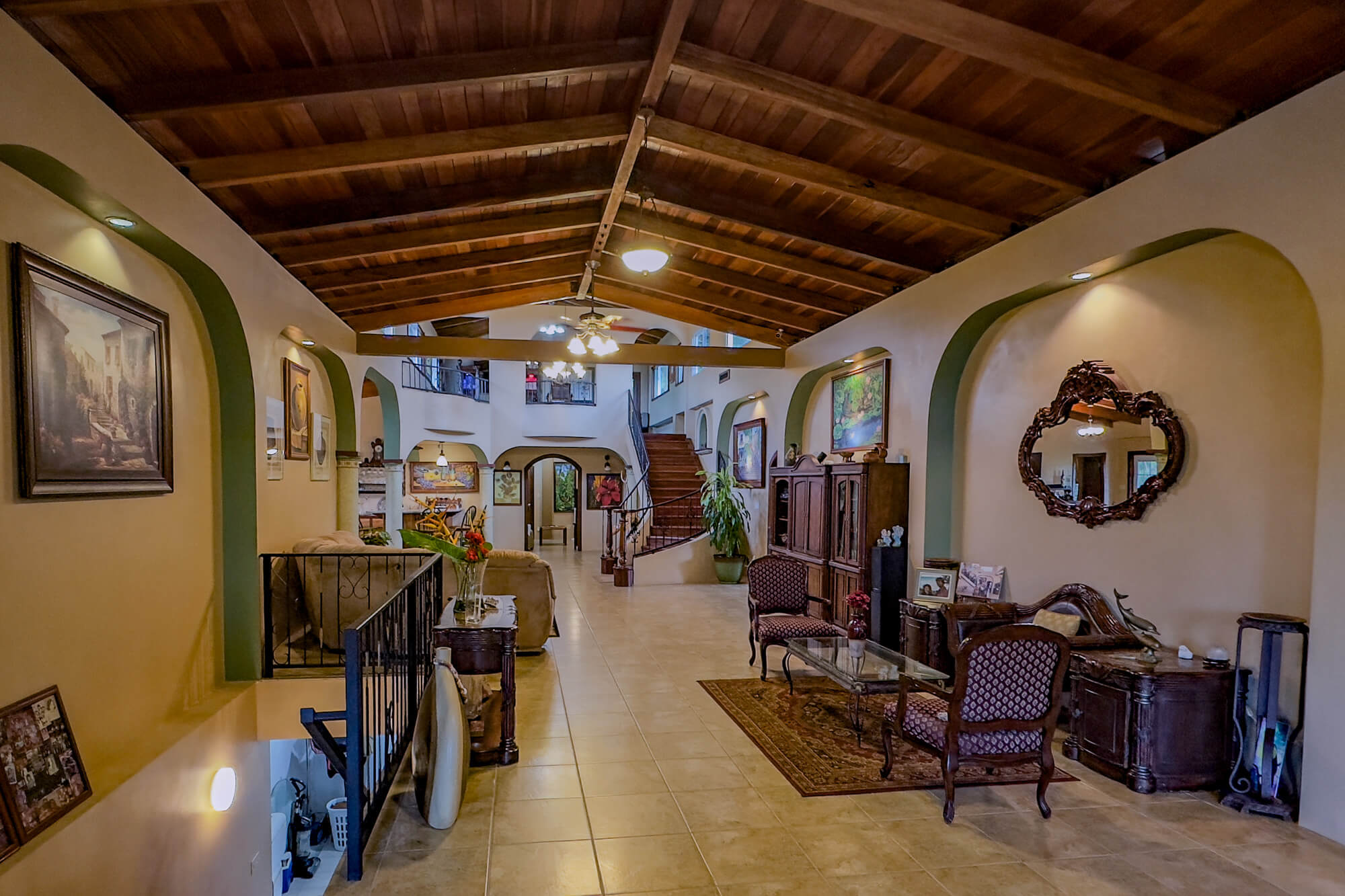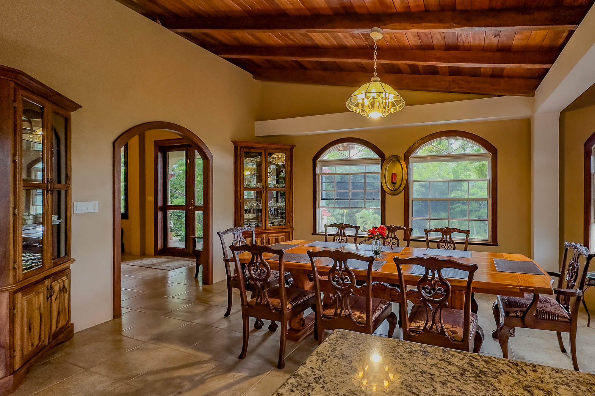 From its commanding position, the home enjoys breathtaking panoramic views of the surrounding valleys, distant mountains, and historic landmarks such as Cahal Pech, Spanish Lookout, and even Baldy Beacon. At sunrise, the landscape is often draped in soft morning mist and graced by toucans and other tropical birds, creating a truly magical start to the day. The entryway’s curved, wrought iron-railed staircase leads to a grand covered veranda, where eight-foot carved hardwood french doors open into a magnificent great room. Soaring Belizean hardwood ceilings, massive exposed beams, and arched architectural details draw the eye upward to a towering 18-foot central space. The formal dining area, with bay windows framing southern and eastern vistas, is anchored by a ten-foot carved custom hardwood table and flanked by custom China cabinets. The adjoining chef’s kitchen is a culinary masterpiece with exotic Granadillo hardwood cabinetry, granite countertops, a large island with gas cooktop, dual sinks, professional-grade appliances, and a walk-in pantry connecting to a warm, wood-burning fireplace lounge and granite-topped wet bar.