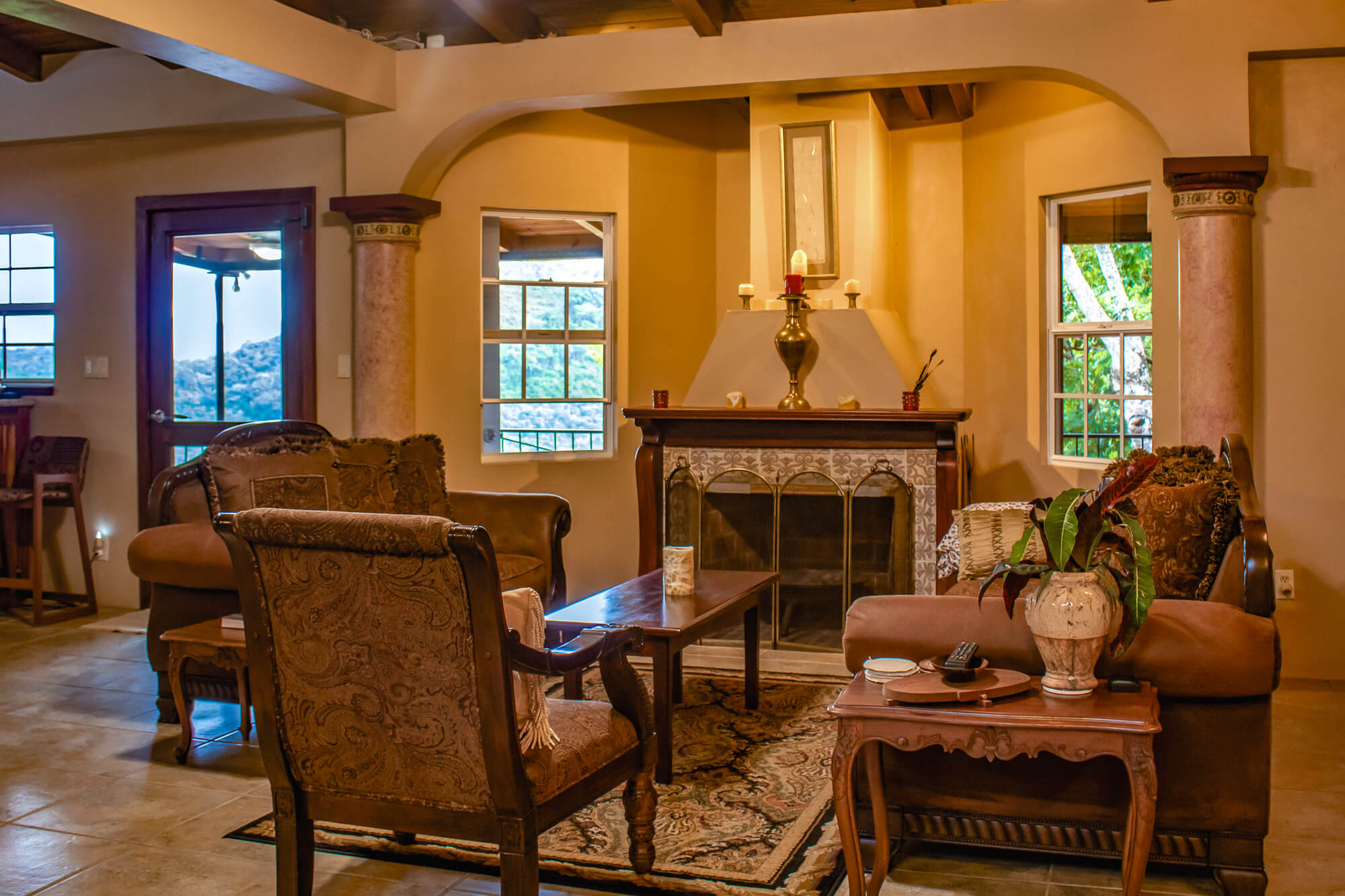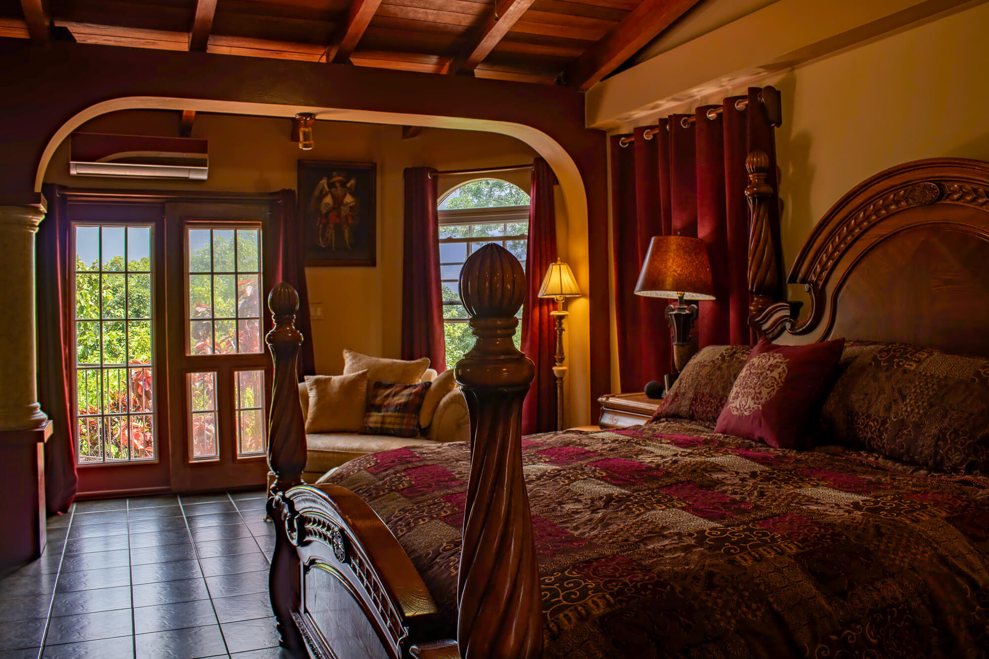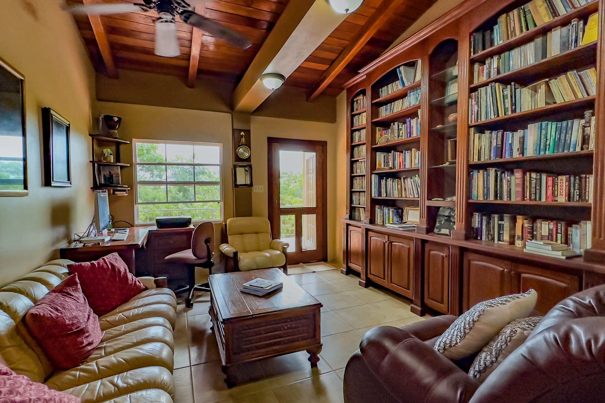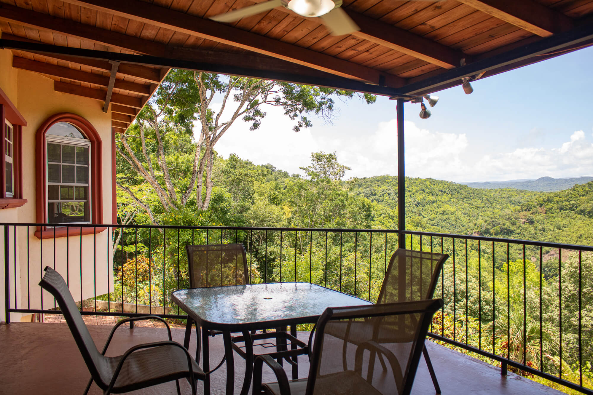 From its commanding position, the home enjoys breathtaking panoramic views of the surrounding valleys, distant mountains, and historic landmarks such as Cahal Pech, Spanish Lookout, and even Baldy Beacon. At sunrise, the landscape is often draped in soft morning mist and graced by toucans and other tropical birds, creating a truly magical start to the day. The entryway’s curved, wrought iron-railed staircase leads to a grand covered veranda, where eight-foot carved hardwood french doors open into a magnificent great room. Soaring Belizean hardwood ceilings, massive exposed beams, and arched architectural details draw the eye upward to a towering 18-foot central space. The formal dining area, with bay windows framing southern and eastern vistas, is anchored by a ten-foot carved custom hardwood table and flanked by custom China cabinets. The adjoining chef’s kitchen is a culinary masterpiece with exotic Granadillo hardwood cabinetry, granite countertops, a large island with gas cooktop, dual sinks, professional-grade appliances, and a walk-in pantry connecting to a warm, wood-burning fireplace lounge and granite-topped wet bar.