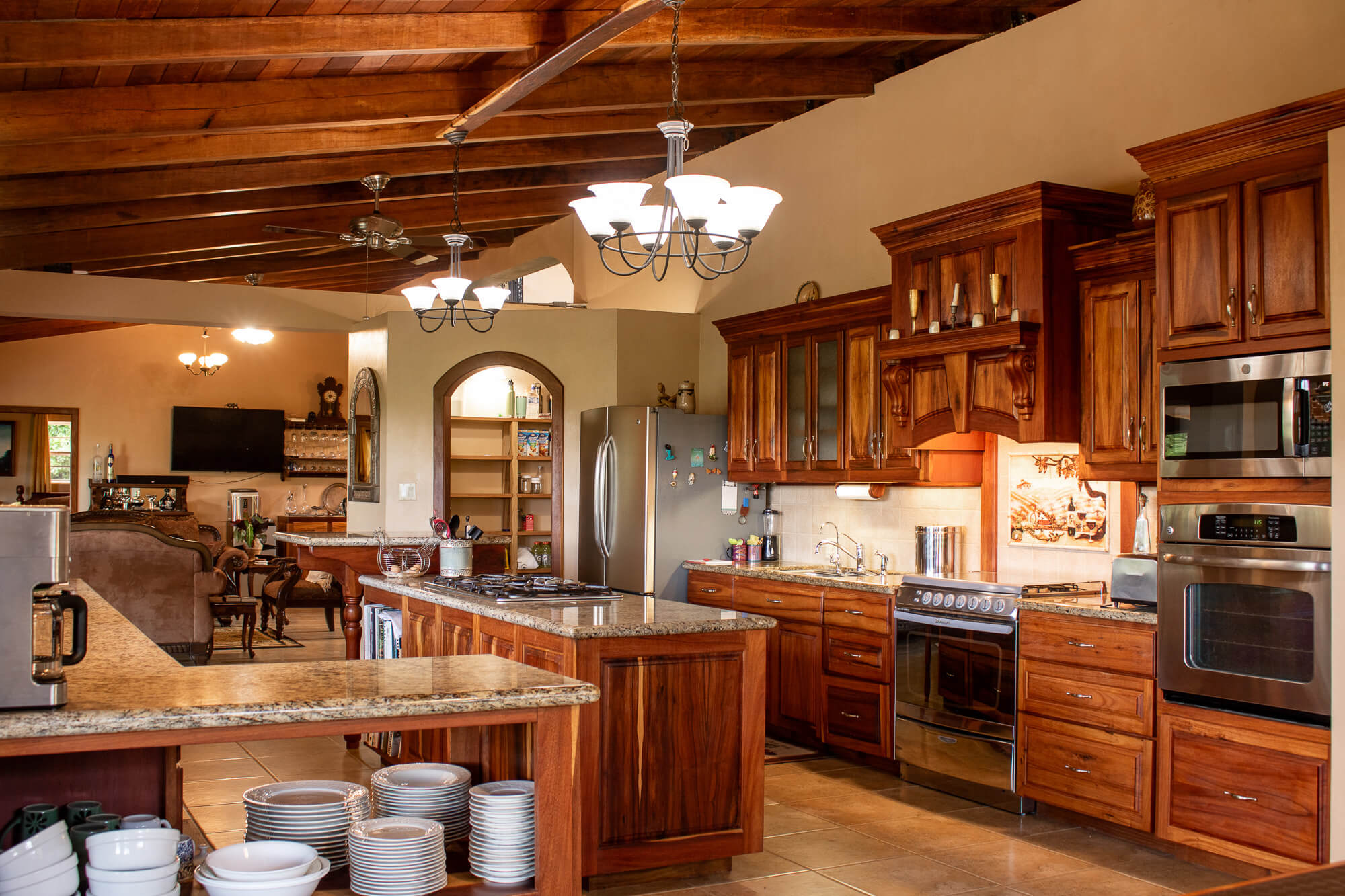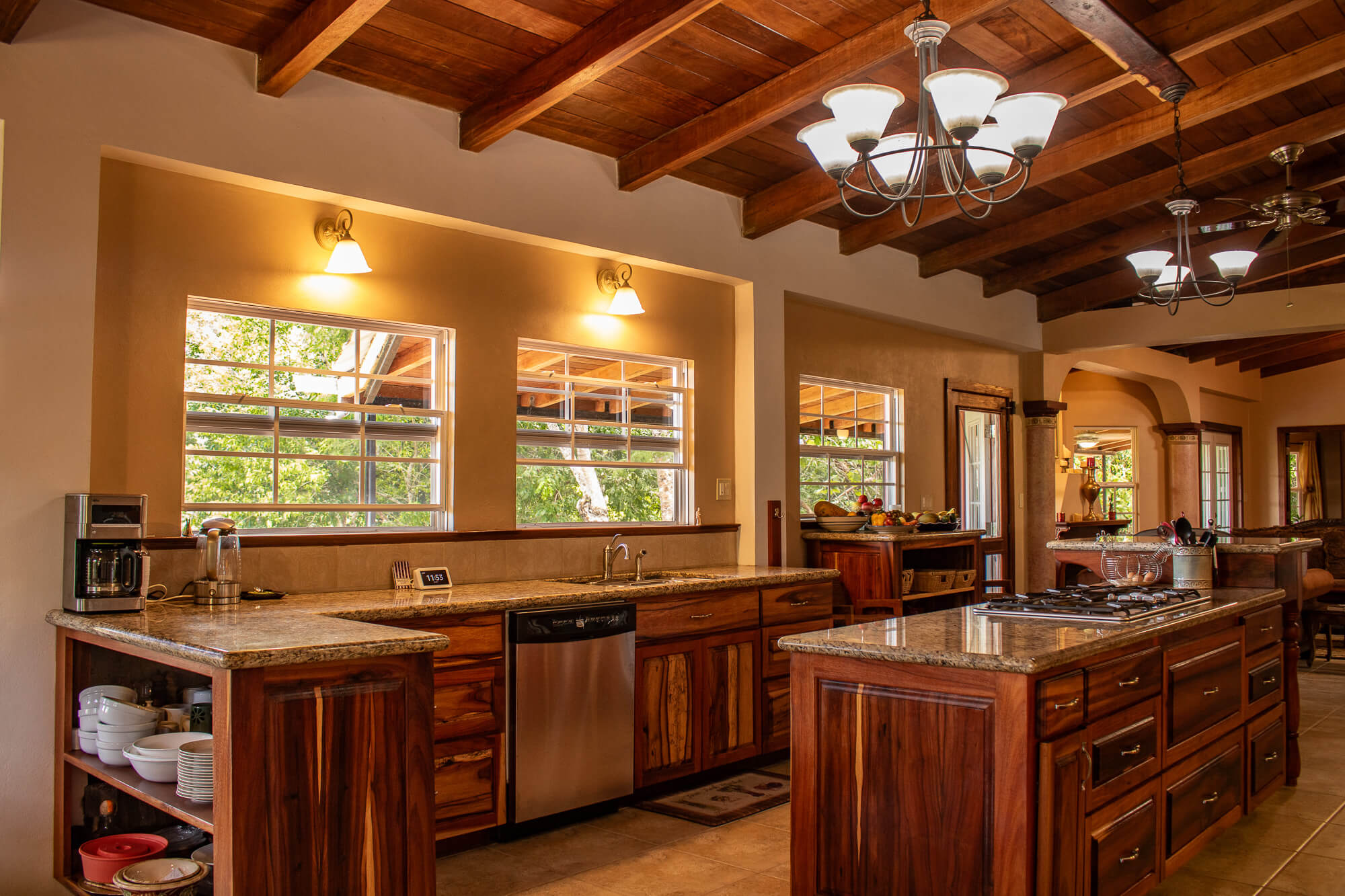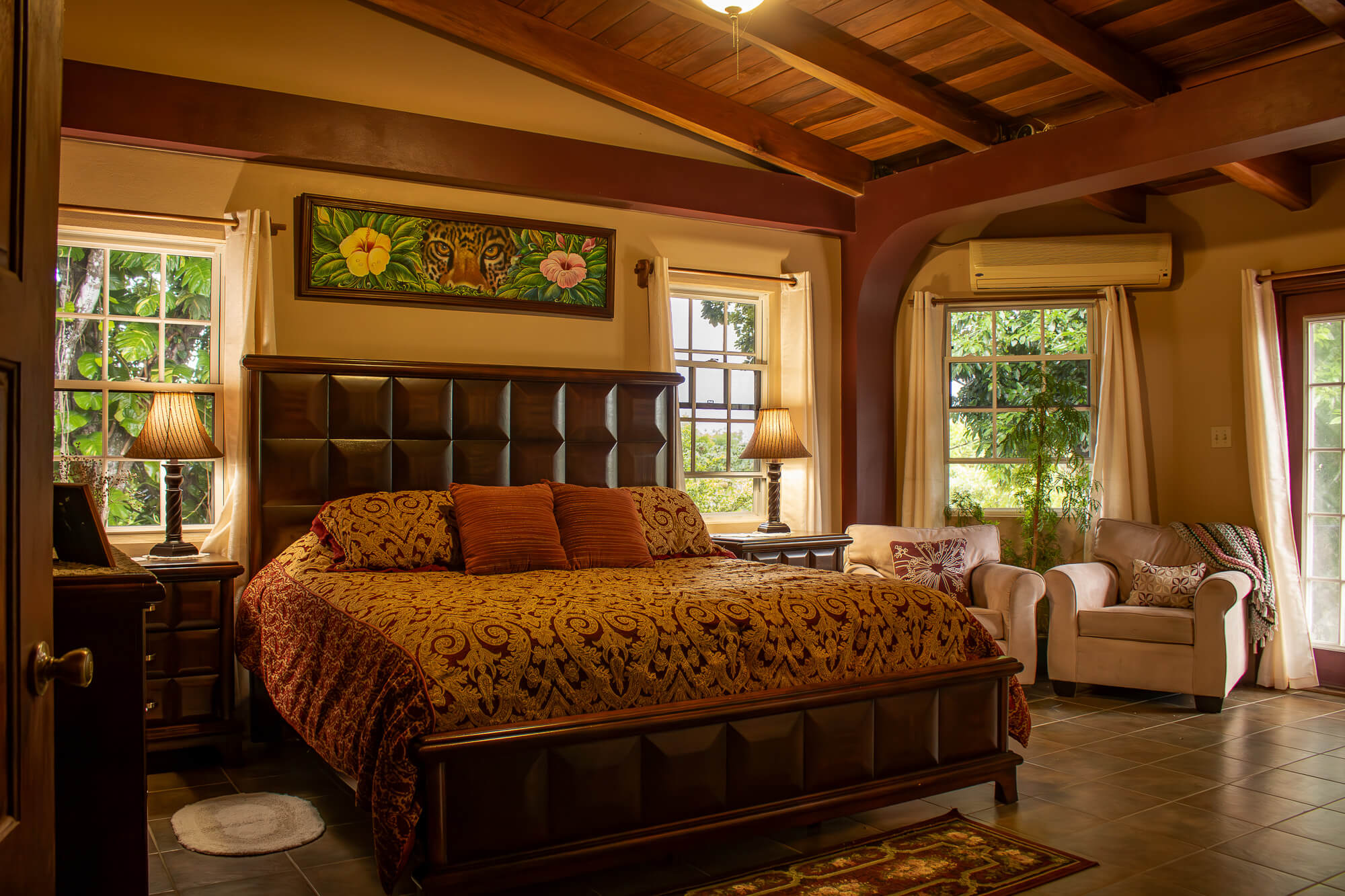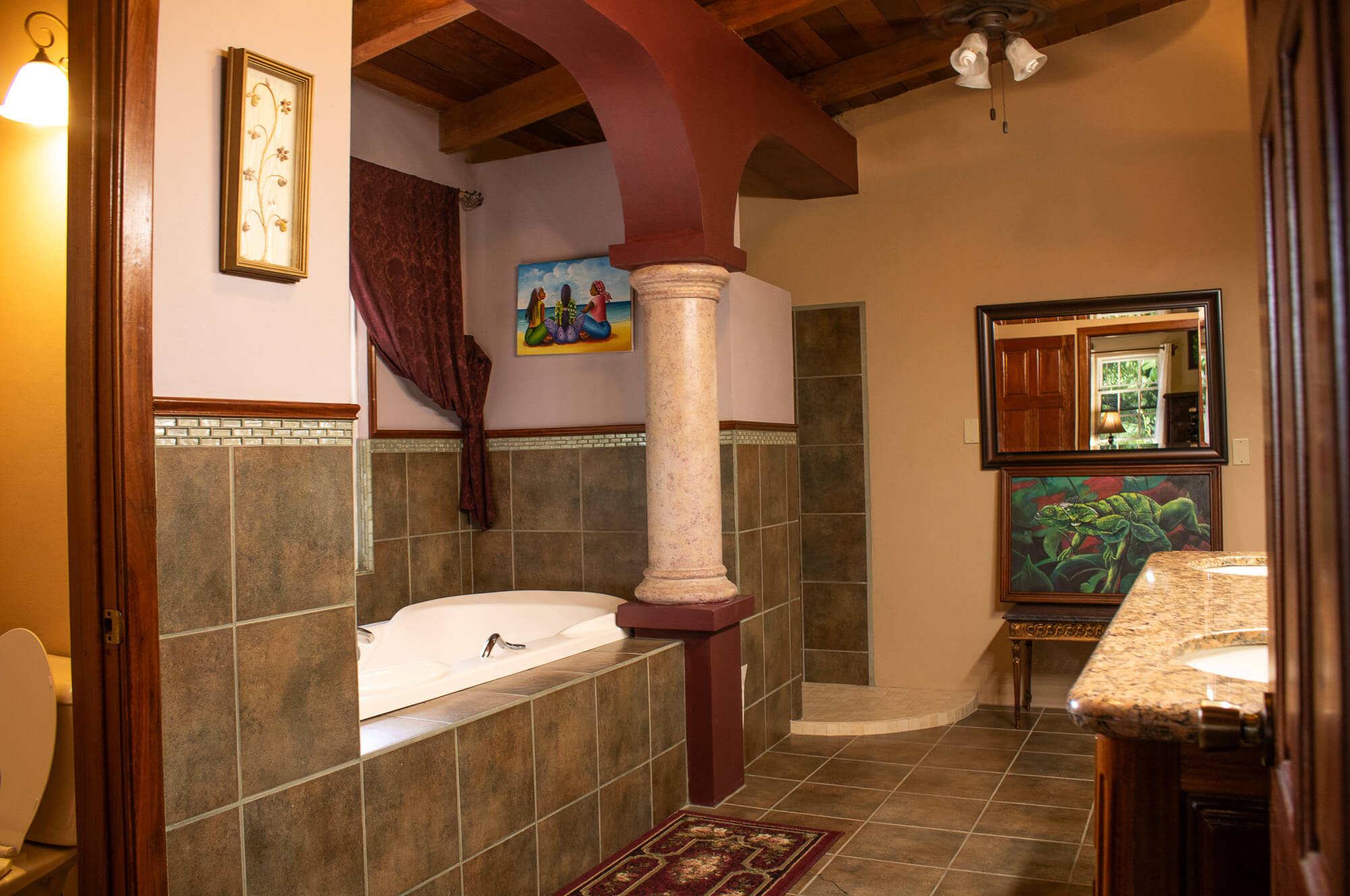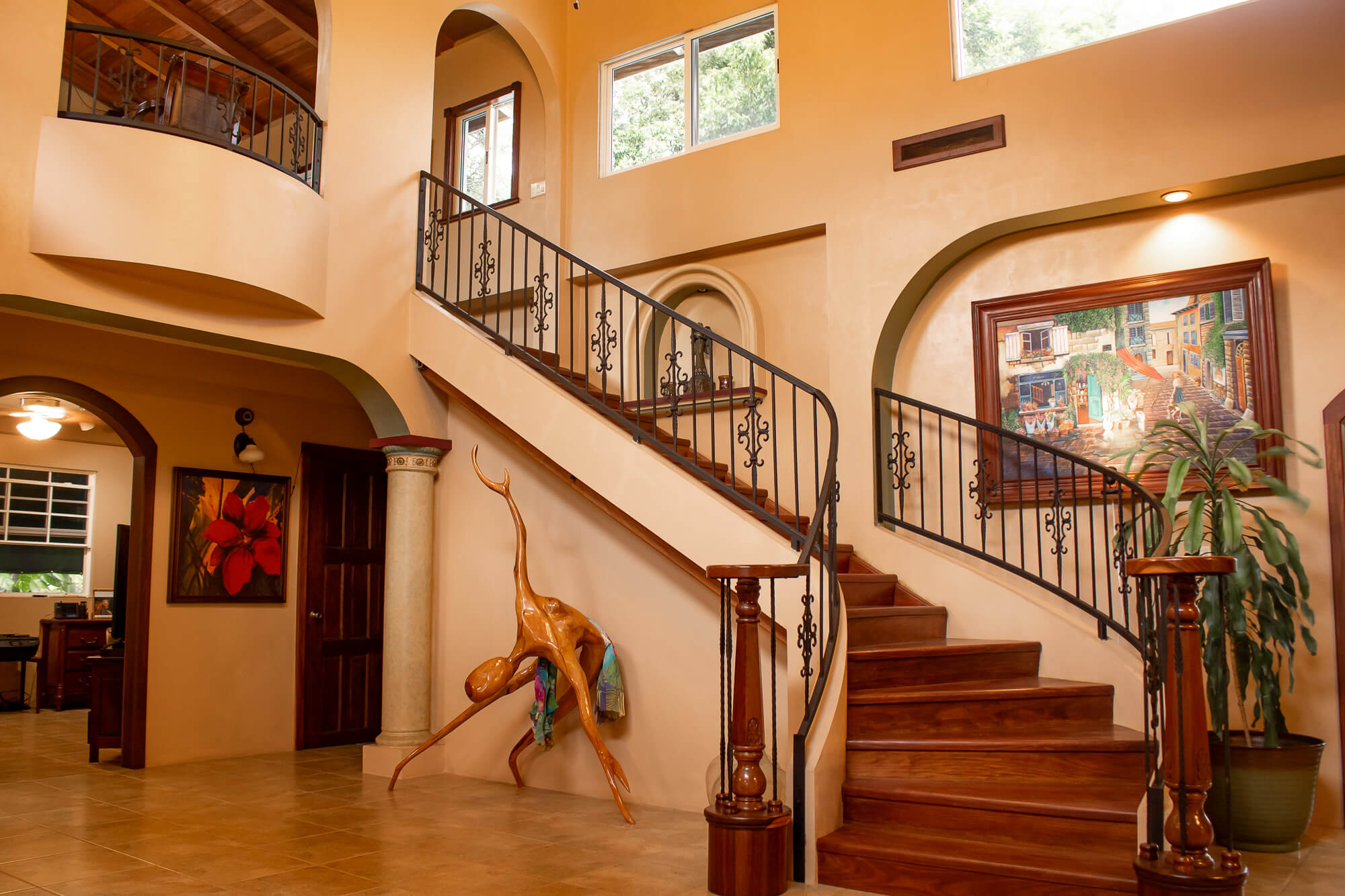 From its commanding position, the home enjoys breathtaking panoramic views of the surrounding valleys, distant mountains, and historic landmarks such as Cahal Pech, Spanish Lookout, and even Baldy Beacon. At sunrise, the landscape is often draped in soft morning mist and graced by toucans and other tropical birds, creating a truly magical start to the day. The entryway’s curved, wrought iron-railed staircase leads to a grand covered veranda, where eight-foot carved hardwood french doors open into a magnificent great room. Soaring Belizean hardwood ceilings, massive exposed beams, and arched architectural details draw the eye upward to a towering 18-foot central space. The formal dining area, with bay windows framing southern and eastern vistas, is anchored by a ten-foot carved custom hardwood table and flanked by custom China cabinets. The adjoining chef’s kitchen is a culinary masterpiece with exotic Granadillo hardwood cabinetry, granite countertops, a large island with gas cooktop, dual sinks, professional-grade appliances, and a walk-in pantry connecting to a warm, wood-burning fireplace lounge and granite-topped wet bar.