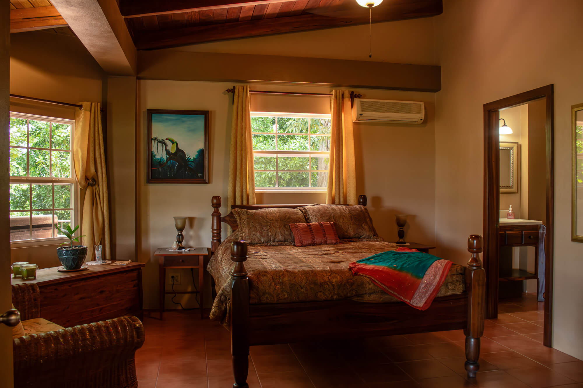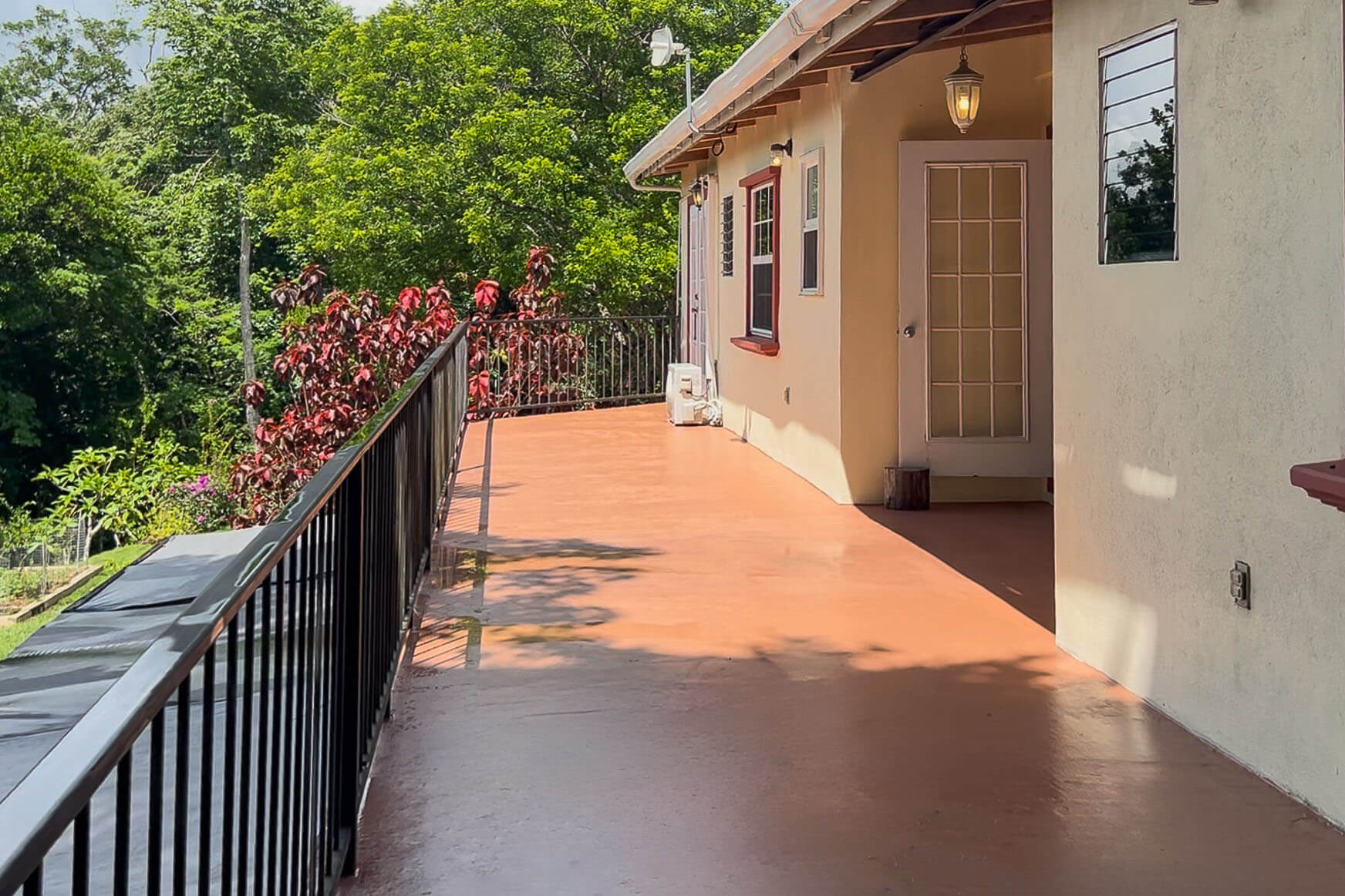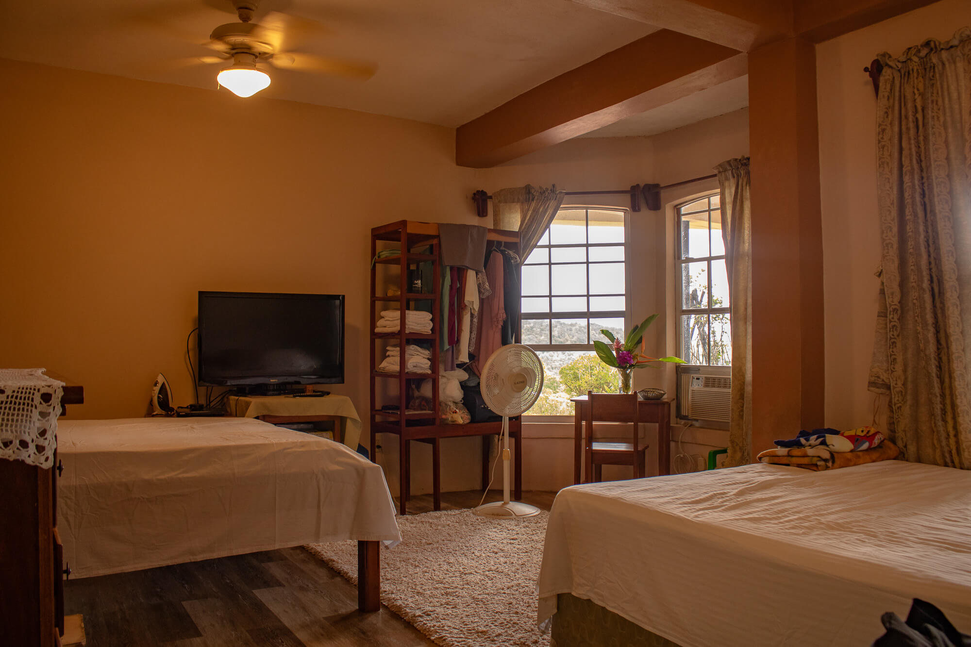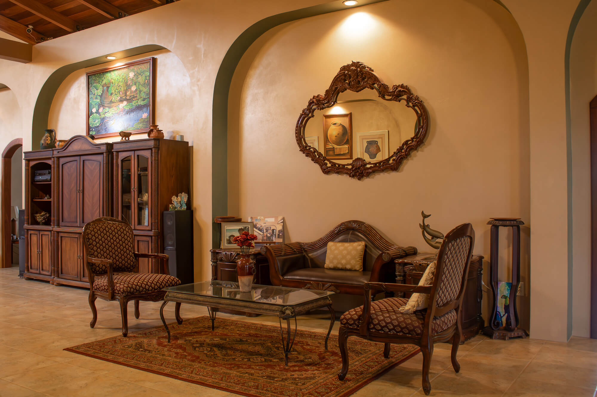From its commanding position, the home enjoys breathtaking panoramic views of the surrounding valleys, distant mountains, and historic landmarks such as Cahal Pech, Spanish Lookout, and even Baldy Beacon. At sunrise, the landscape is often draped in soft morning mist and graced by toucans and other tropical birds, creating a truly magical start to the day. The entryway’s curved, wrought iron-railed staircase leads to a grand covered veranda, where eight-foot carved hardwood french doors open into a magnificent great room. Soaring Belizean hardwood ceilings, massive exposed beams, and arched architectural details draw the eye upward to a towering 18-foot central space. The formal dining area, with bay windows framing southern and eastern vistas, is anchored by a ten-foot carved custom hardwood table and flanked by custom China cabinets. The adjoining chef’s kitchen is a culinary masterpiece with exotic Granadillo hardwood cabinetry, granite countertops, a large island with gas cooktop, dual sinks, professional-grade appliances, and a walk-in pantry connecting to a warm, wood-burning fireplace lounge and granite-topped wet bar.