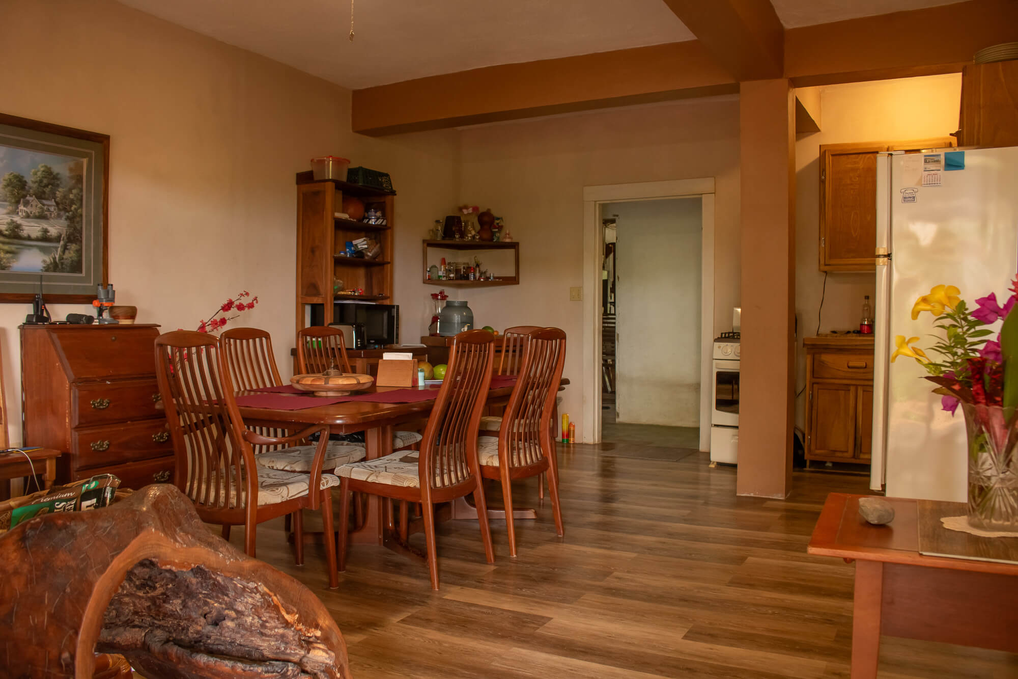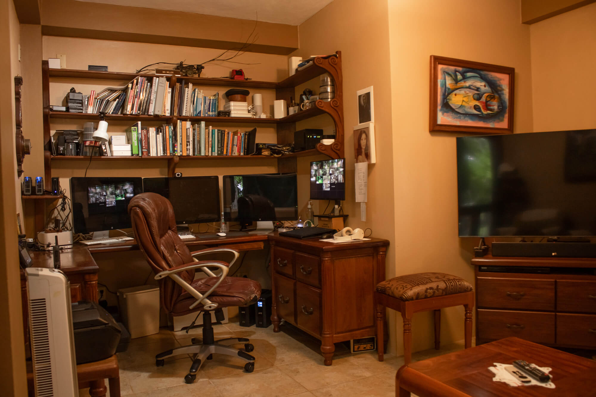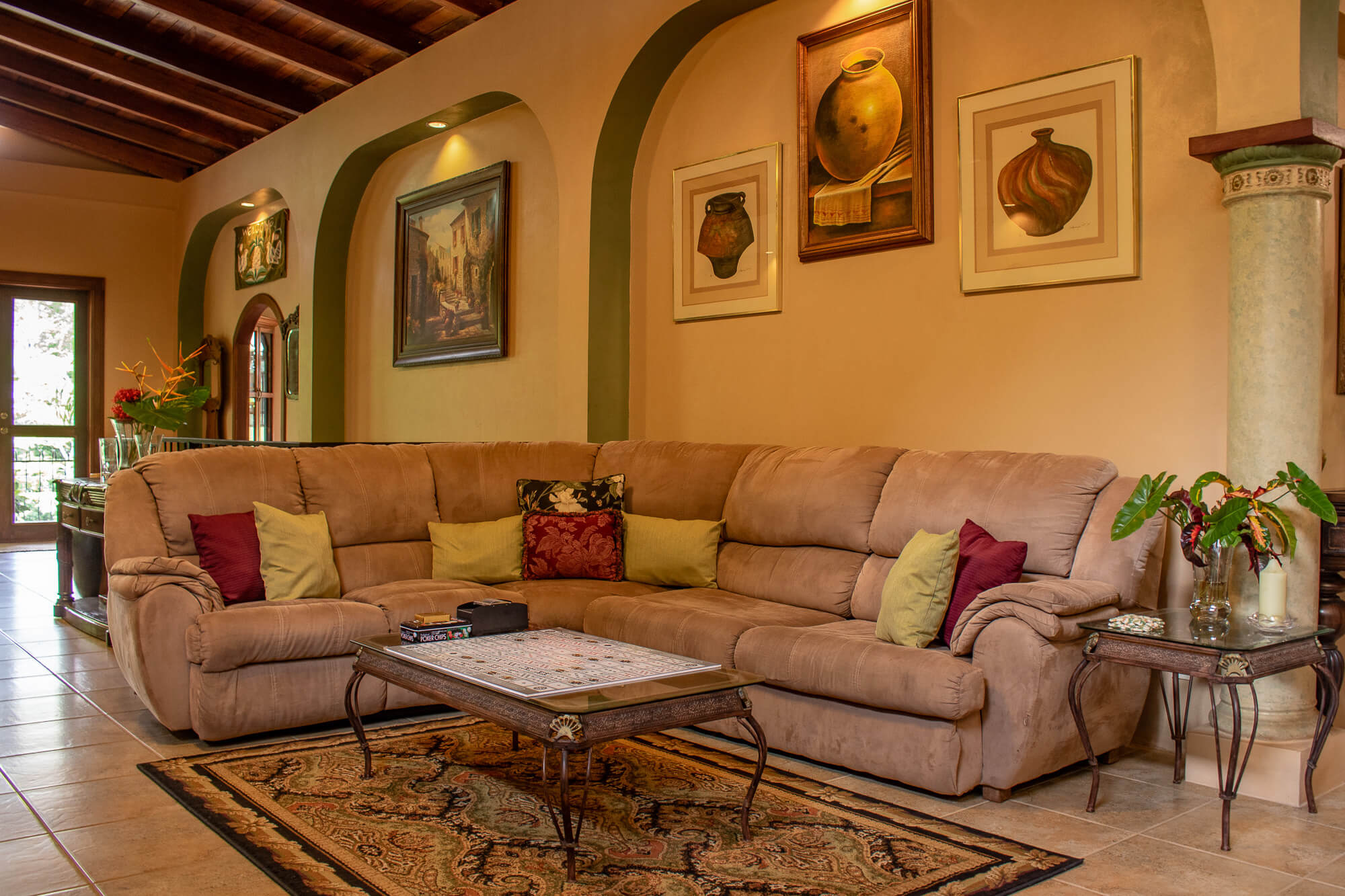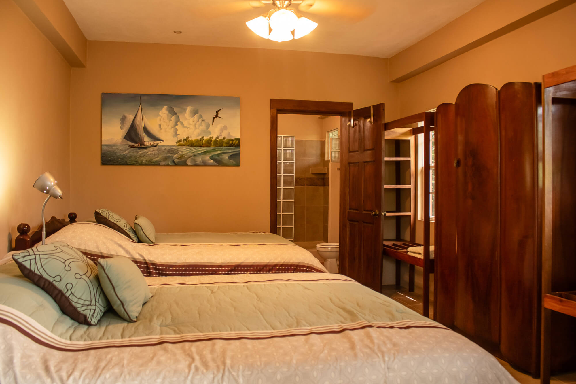 From its commanding position, the home enjoys breathtaking panoramic views of the surrounding valleys, distant mountains, and historic landmarks such as Cahal Pech, Spanish Lookout, and even Baldy Beacon. At sunrise, the landscape is often draped in soft morning mist and graced by toucans and other tropical birds, creating a truly magical start to the day. The entryway’s curved, wrought iron-railed staircase leads to a grand covered veranda, where eight-foot carved hardwood french doors open into a magnificent great room. Soaring Belizean hardwood ceilings, massive exposed beams, and arched architectural details draw the eye upward to a towering 18-foot central space. The formal dining area, with bay windows framing southern and eastern vistas, is anchored by a ten-foot carved custom hardwood table and flanked by custom China cabinets. The adjoining chef’s kitchen is a culinary masterpiece with exotic Granadillo hardwood cabinetry, granite countertops, a large island with gas cooktop, dual sinks, professional-grade appliances, and a walk-in pantry connecting to a warm, wood-burning fireplace lounge and granite-topped wet bar.