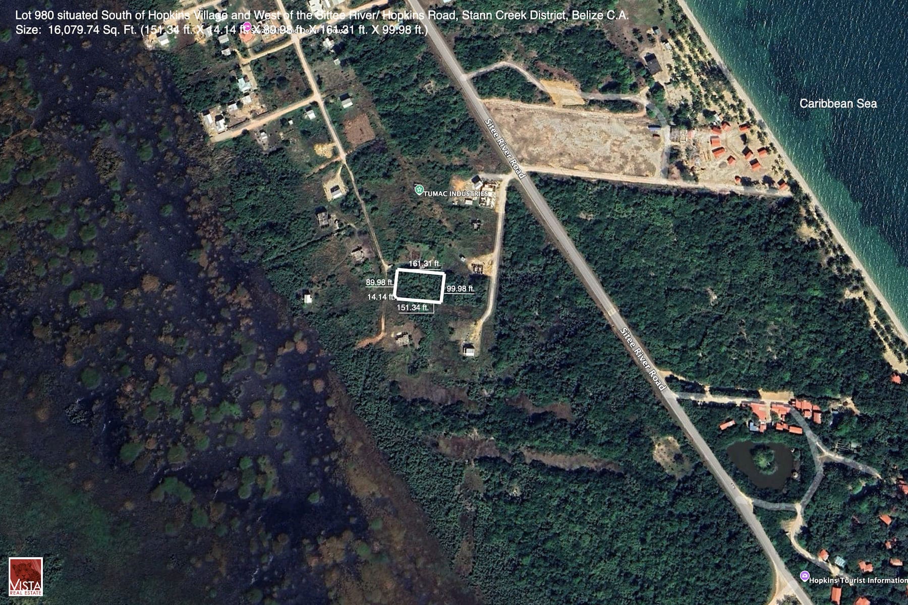 Attractive lot measures 161.31 ft. x 99.98 ft. x 151.34 ft. x 12.14 ft. x 89.9 8 ft. situated 420 ft (+/-) west of Sittee River Road and approximately 0.25 mile from the Caribbean Sea.
