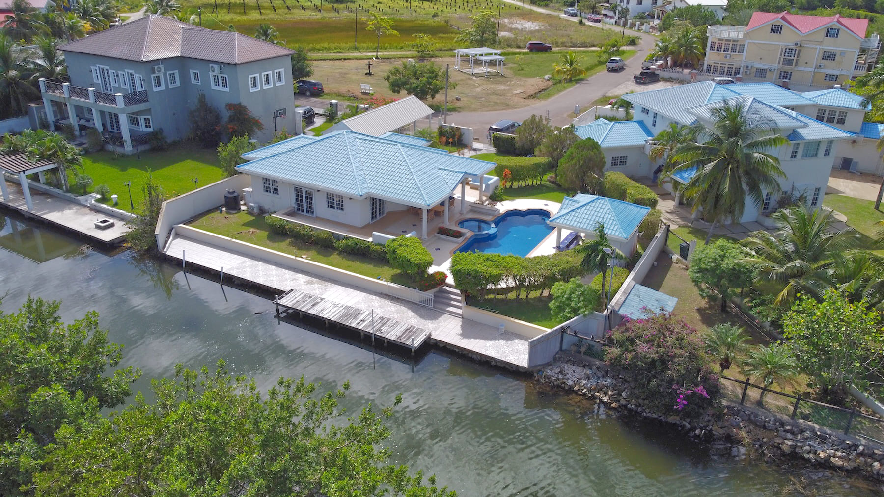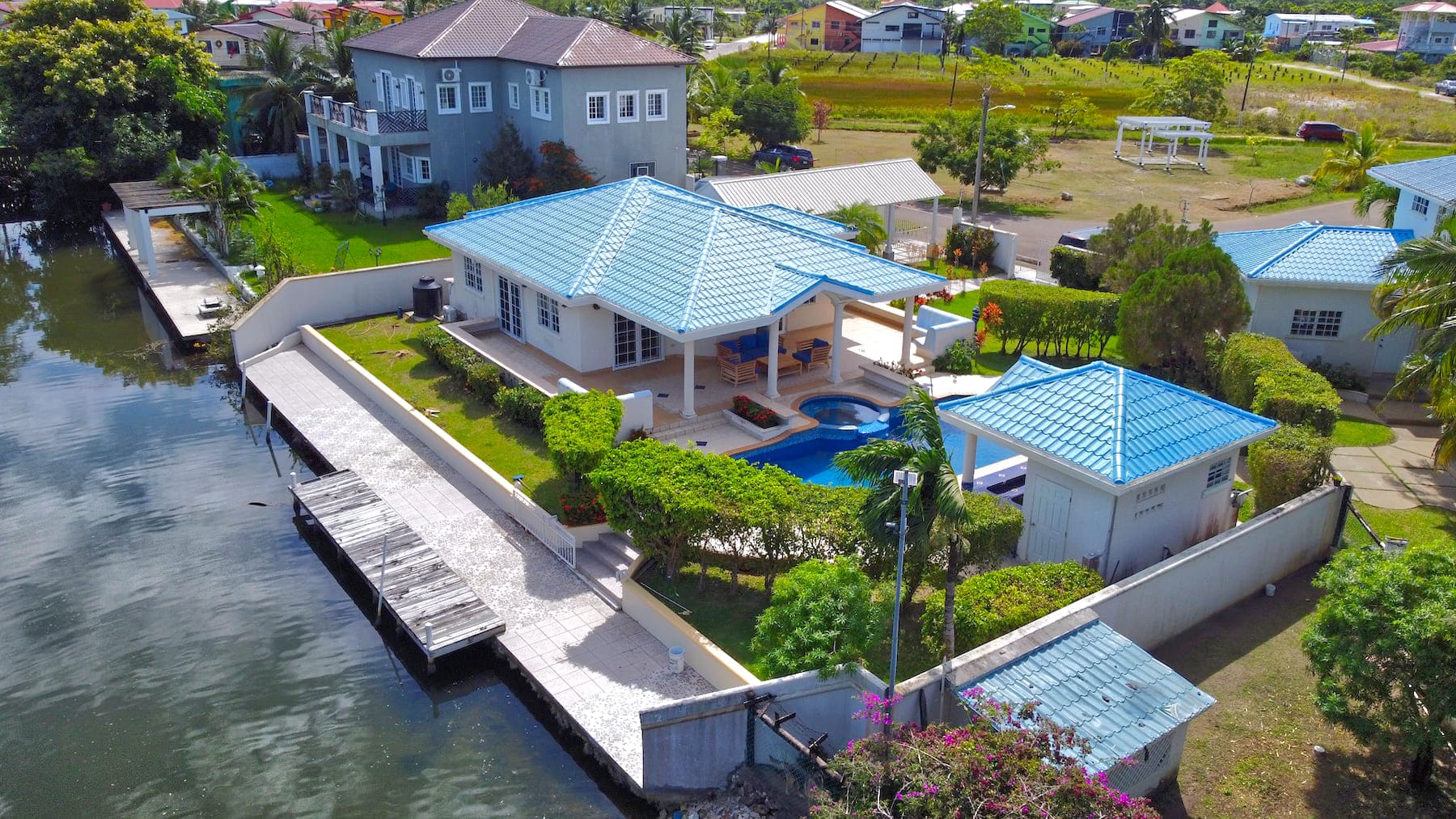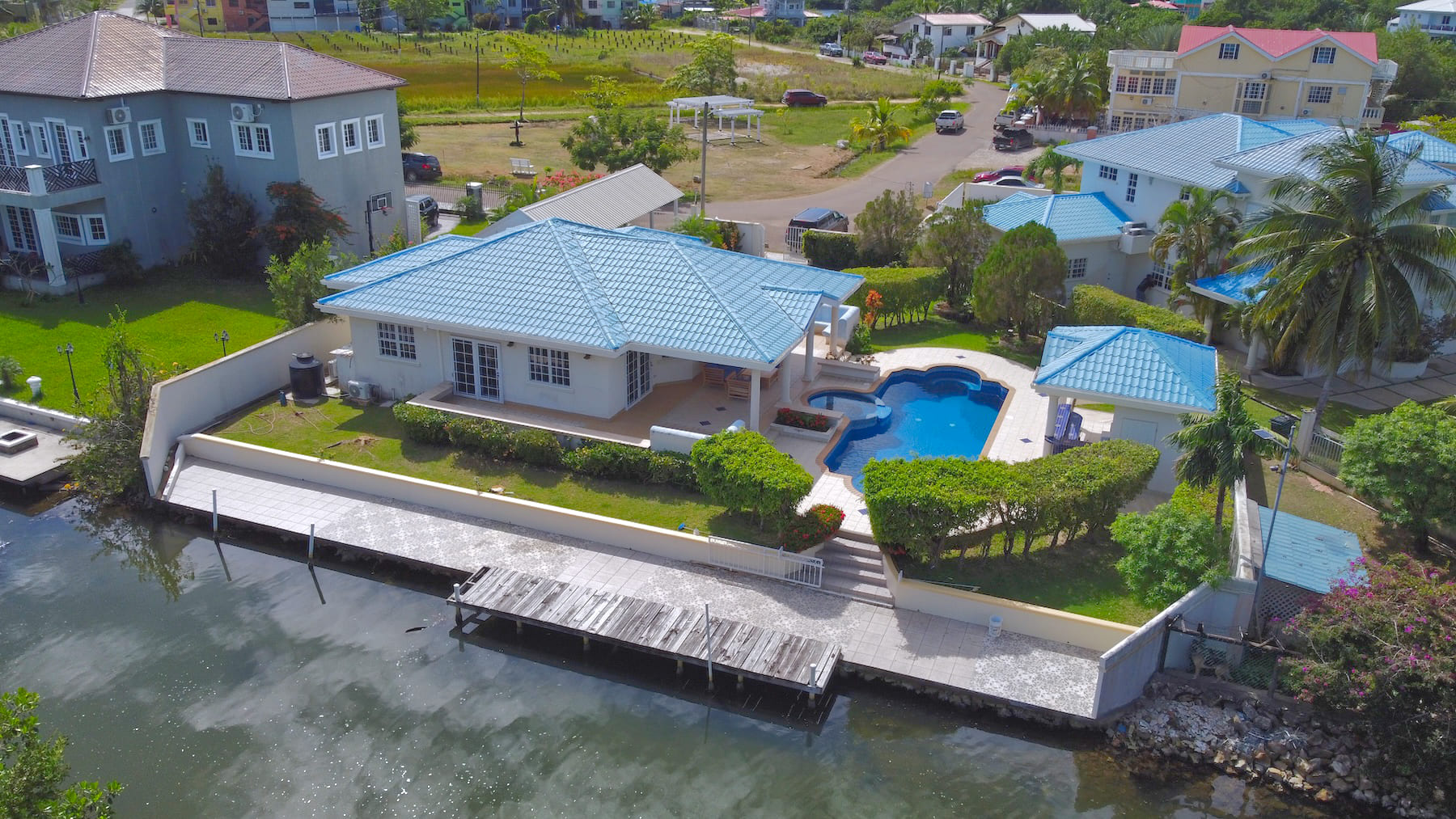 This impeccable, unfurnished 2-bedroom, 2.5-bathroom modern home features a private pool and stands as one of the finest properties in the Vista Del Mar waterfront community of Ladyville, Belize. Situated on a 0.23-acre canal-front parcel, it perfectly blends comfort, convenience, and accessibility.