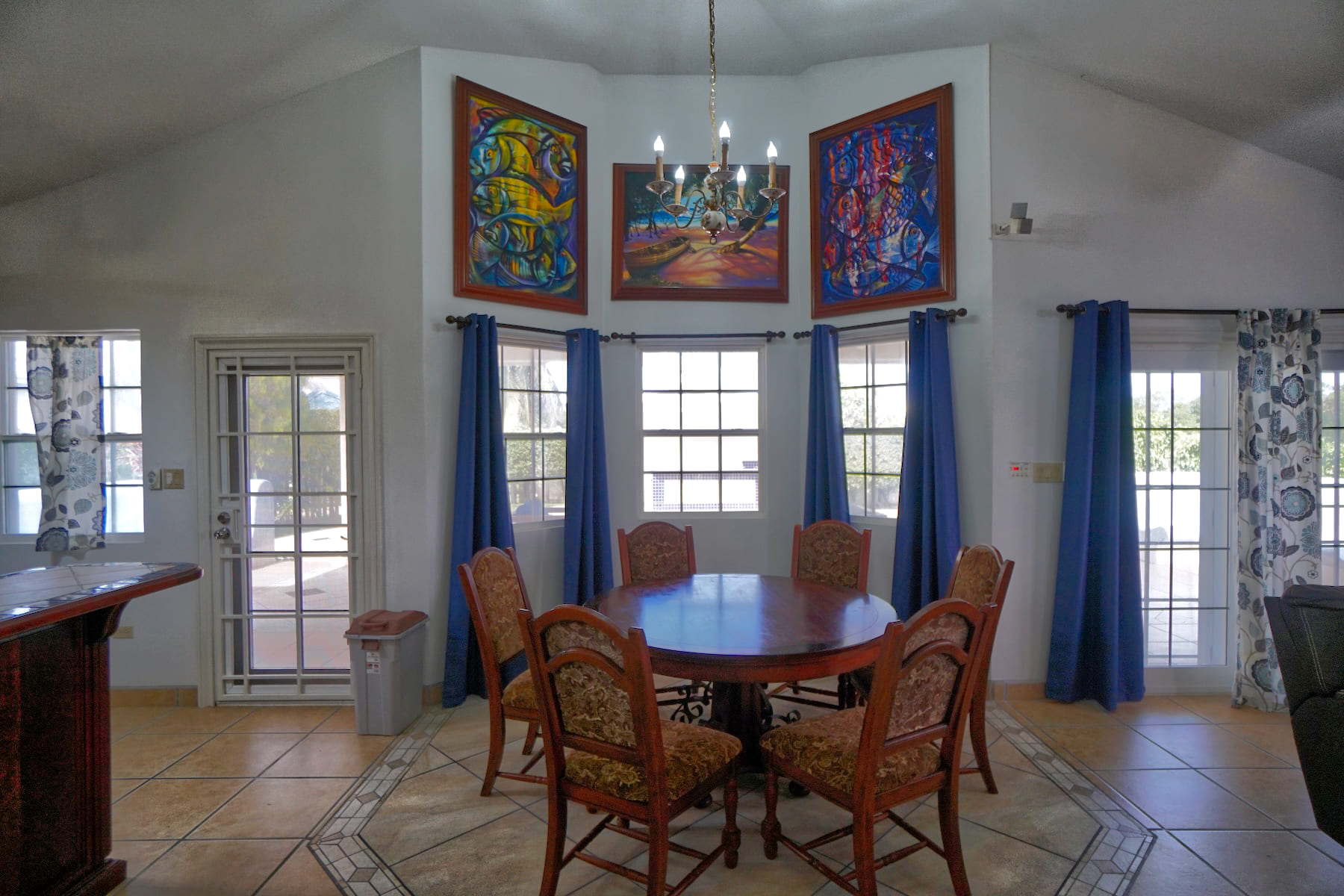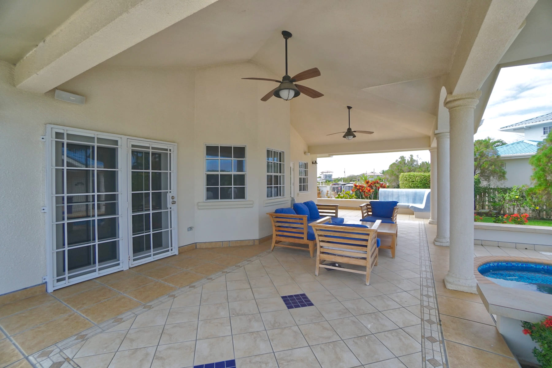 All windows are secured with security bars. Outside, the home opens to a U-shaped, fully-tiled patio with a partially covered roof.
