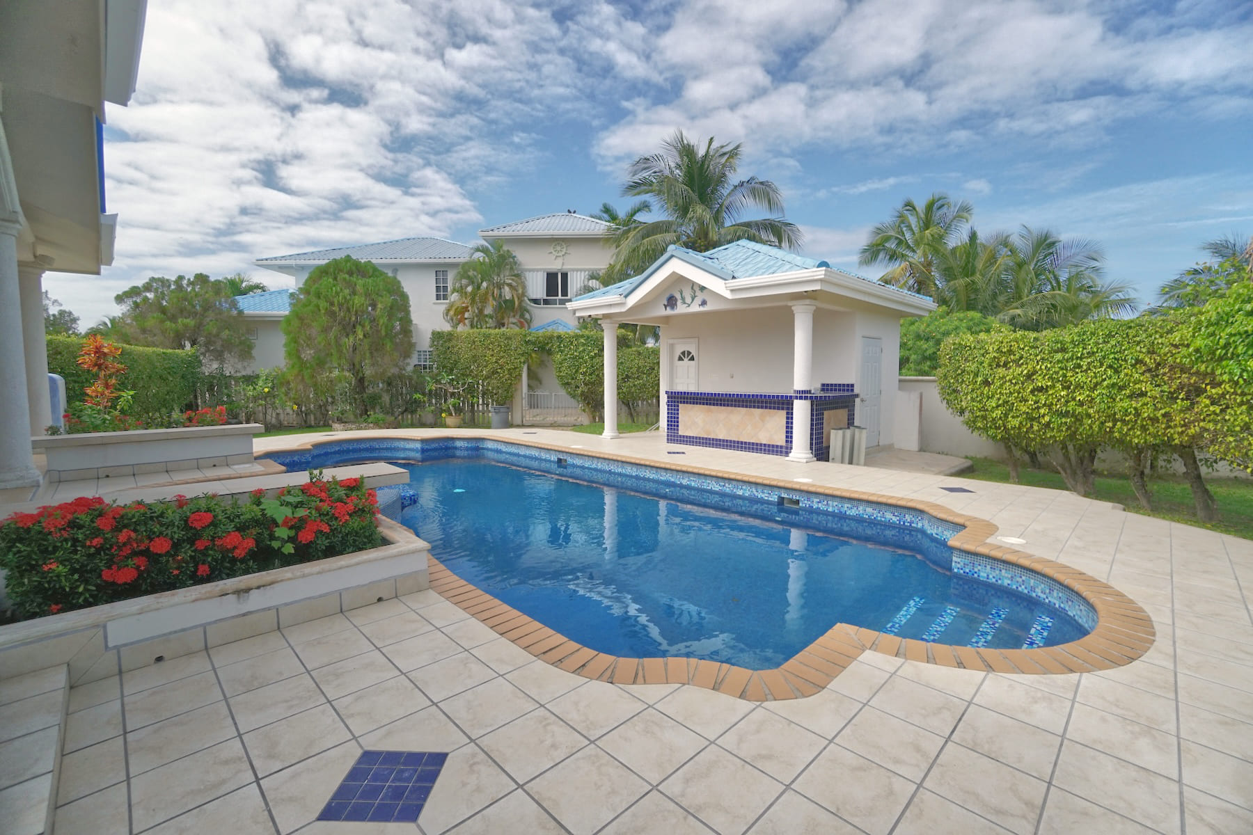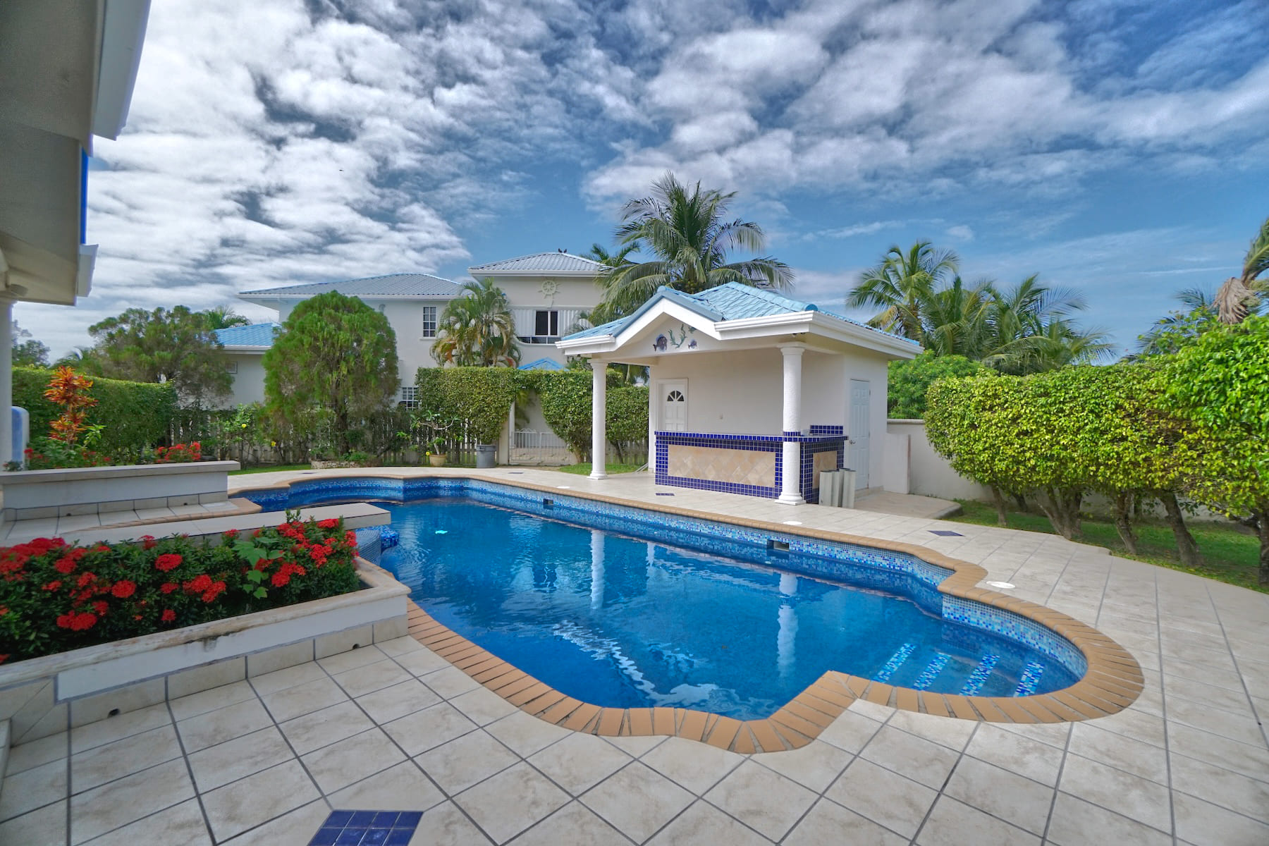 The property features an expansive outdoor pool (408 sq. ft.), perfect for refreshing dips. Also on the property is a concrete storehouse (approx. 270 sq. ft.) which includes a water pump, a half bath, and an attached bar and shower that connects directly to the poolside area.