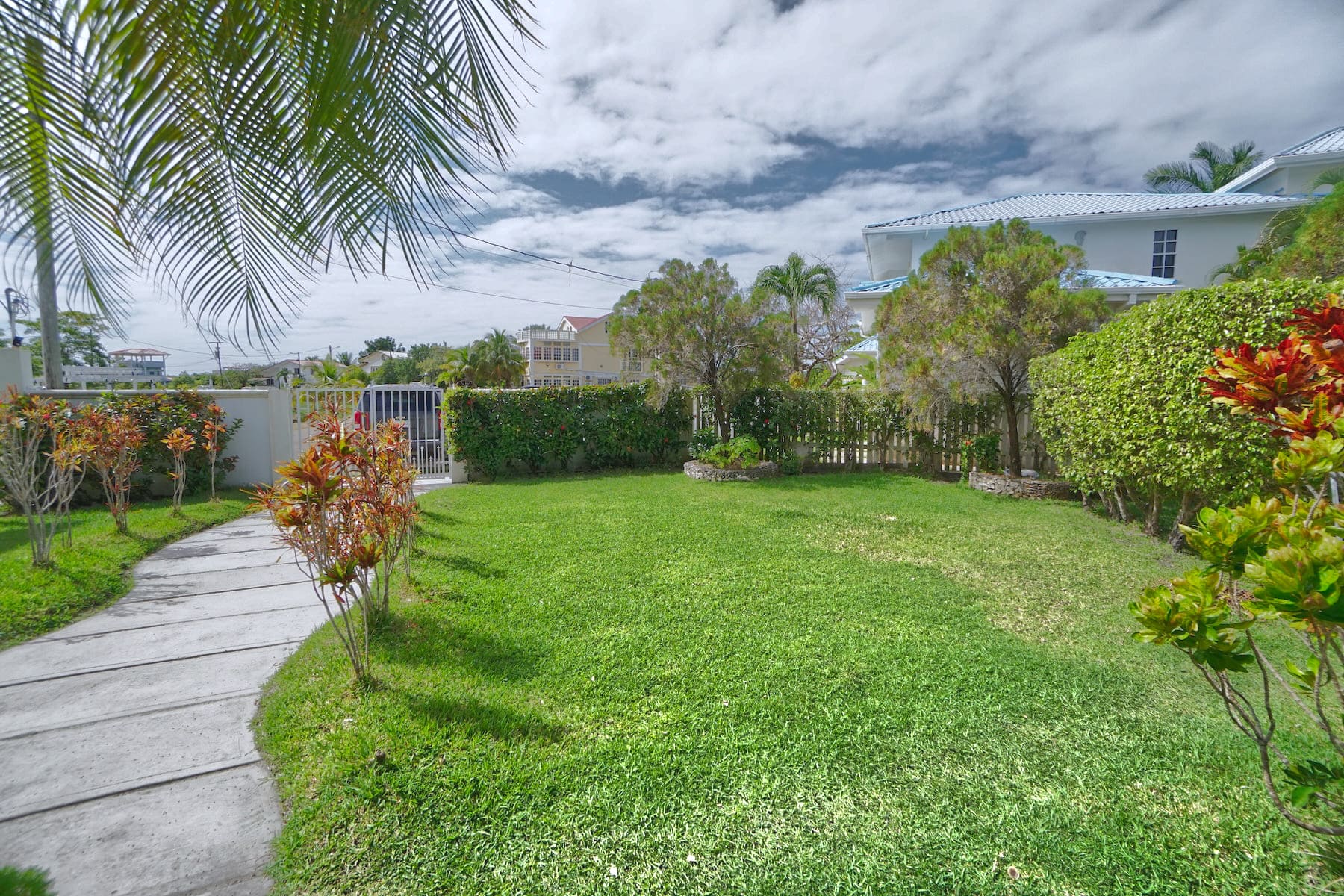 A concrete seawall and boat launch face the canal. While the dock itself is wooden, the path leading to it is fully tiled. The yard is neatly manicured with decorative tropical plants and secured by a sturdy concrete fence.